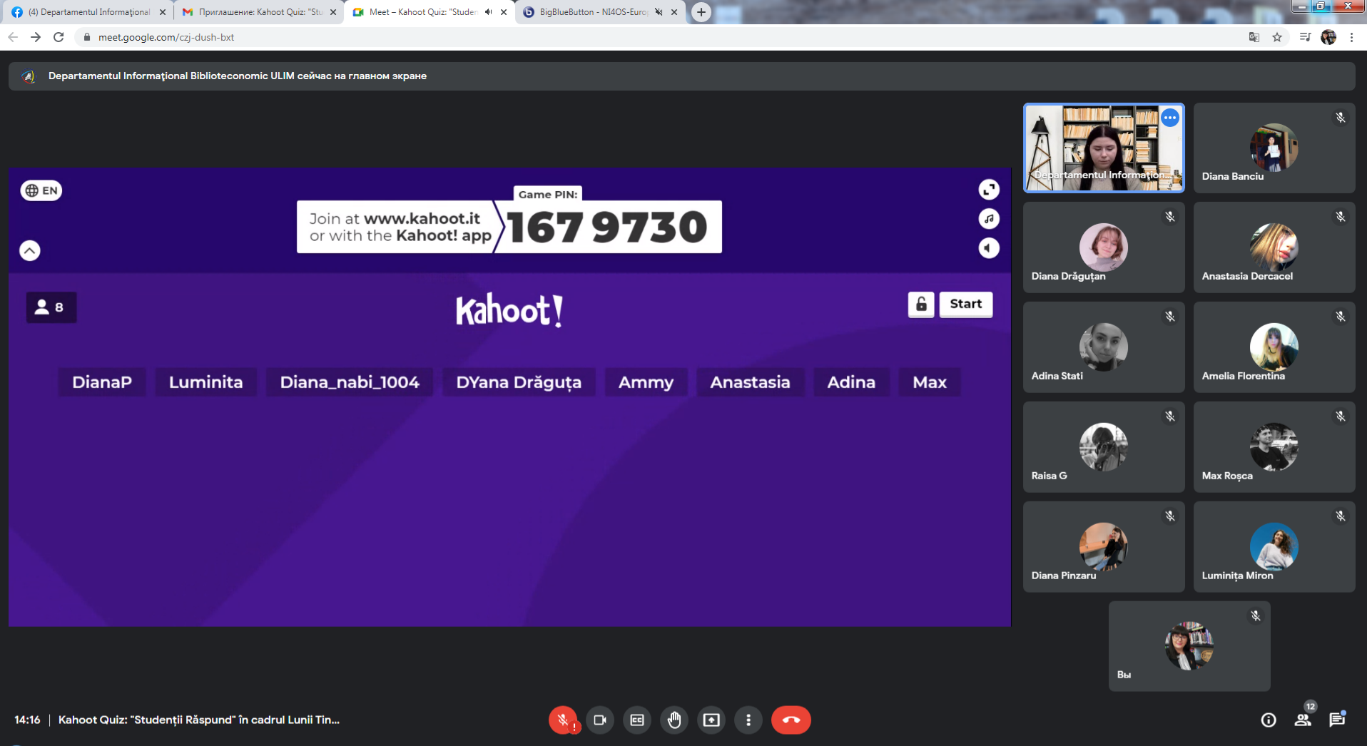 Astăzi, jocul Kahoot a întrunit 10 participanti. Prin prisma unor modele interactive de asimilare a informației despre angajamentul civic a studentilor și cultivarea toleranței acestora, cu scopul de