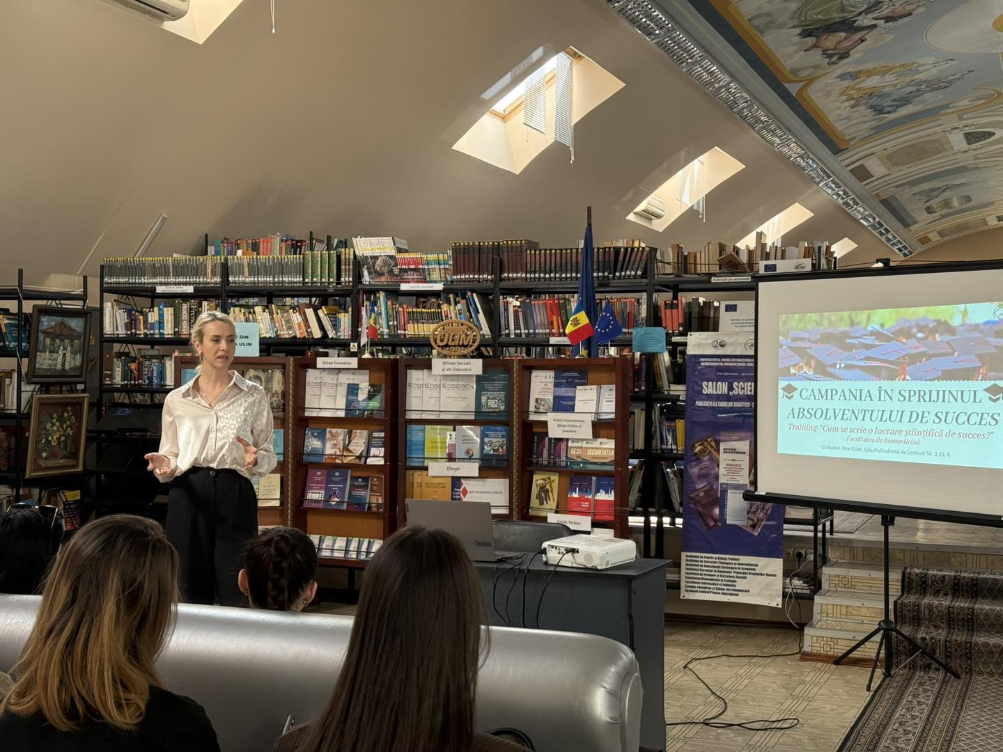 Absolventa de succes a Facultății de Biomedicină, Anastasia Cucu a prezentat un training despre pașii esențiali în redactarea unei lucrări științifice, abordând subiecte precum structura corectă a unei prezentări de licență, utilizarea surselor de informație relevante și actuale, precum și menționarea elementelor vizuale în text. De asemenea, au fost discutate aspecte tehnice legate de organizarea bibliografiei.